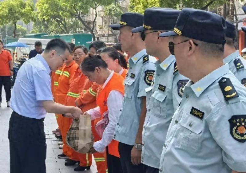 在江汉路步行街区,副区长余建清带领区城管执法局、花楼水塔街主要领导慰问坚守岗位的环卫和城管工作人员,为他们送上防暑降温物资,并叮嘱大家注意防暑降温,科学安排作息时间,确保健康和安全。